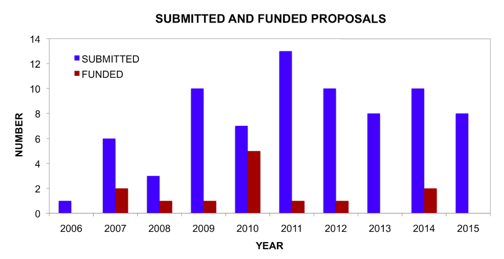 I have been in my current position for nine years. I submitted plenty of research proposals before I came to MSU, but I have now established a long-ish record of proposal writing and grantsmanship at one institution. I did a quick search through our proposal database and figured out that I submitted, either as PI or co-PI, at least 68 proposals between August 2006 and December 2014. That is an average of about 8.5 proposals per year. Here is a nifty graph of submitted proposals from 2006-2014 contrasted with the number of those proposals that were actually funded:
