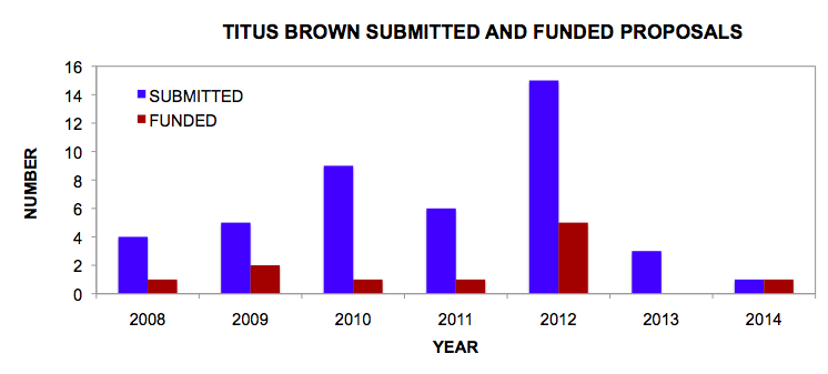 My colleague, Titus Brown, was nice enough to offer his proposal acceptance and funding rates to add to this conversation. Titus works at the intersection between bioscience and computer science. Between 2008 and 2014, Titus submitted 43 proposals. Of these, 11 were funded; that’s a 25% funding rate. Here is his nifty graph – looks similar to mine: